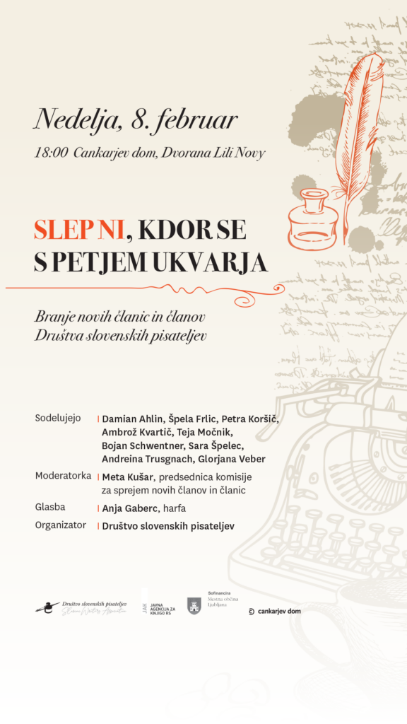Uncategorized Slep ni, kdor se s petjem ukvarja – branje novih članic in članov DSP, 8. 2. ob 18:00, Dvorana Lili Novy, Cankarjev dom 2 februarja, 2026 /