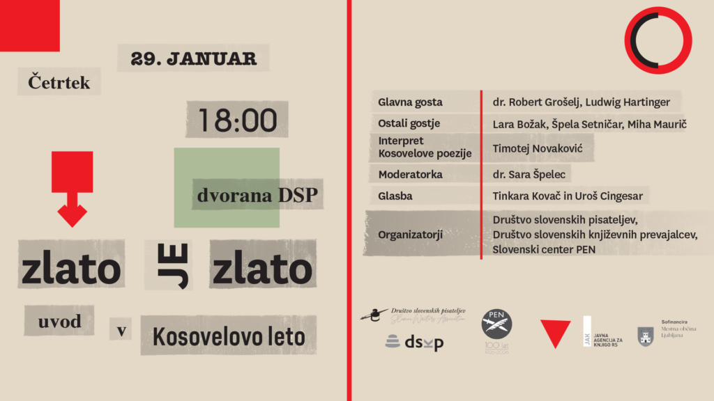 Novice Zlato je zlato: uvod v Kosovelovo leto 22 januarja, 2026 / 29. januar 202618:00Dvorana Društva slovenskih pisateljev v soorganizaciji Društva slovenskih književnih prevajalcev in Slovenskega centra PEN VLJUDNO VABLJENI!